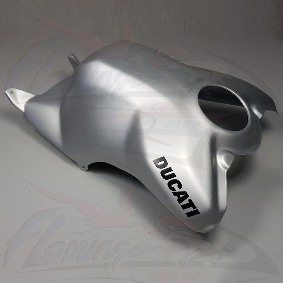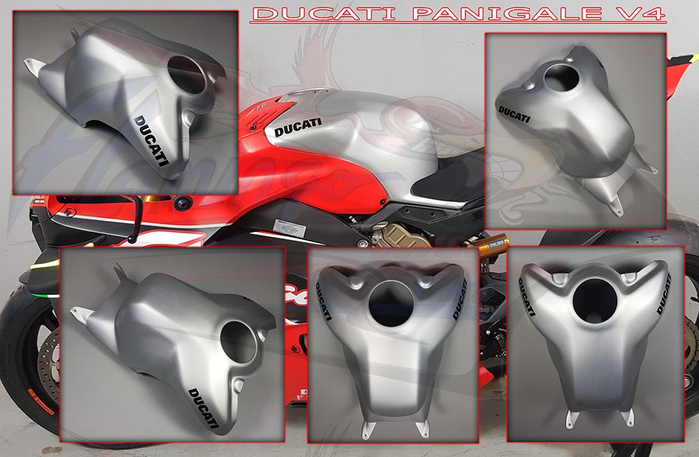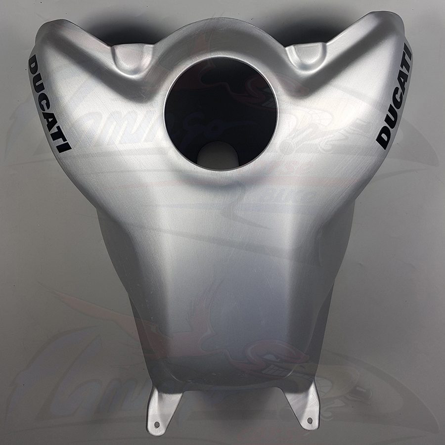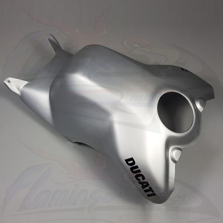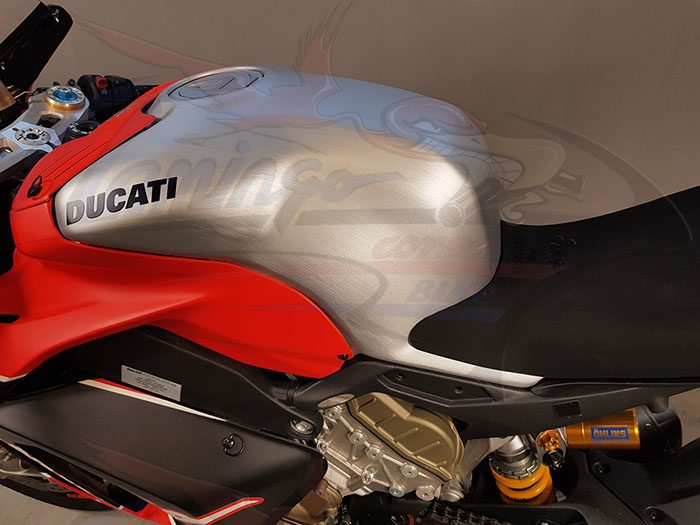 Ripara il serbatoio in caso di caduta, allungato per migliorare l'appoggio in frenata e la guidabilità, fornito colorato con effetto alluminio spazzolato tipo V4R.