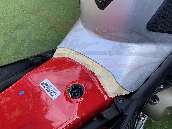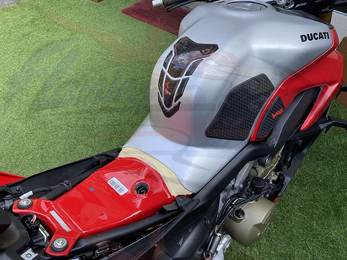 Ripara il serbatoio in caso di caduta, allungato per migliorare l'appoggio in frenata e la guidabilità, fornito colorato con effetto alluminio spazzolato tipo V4R.