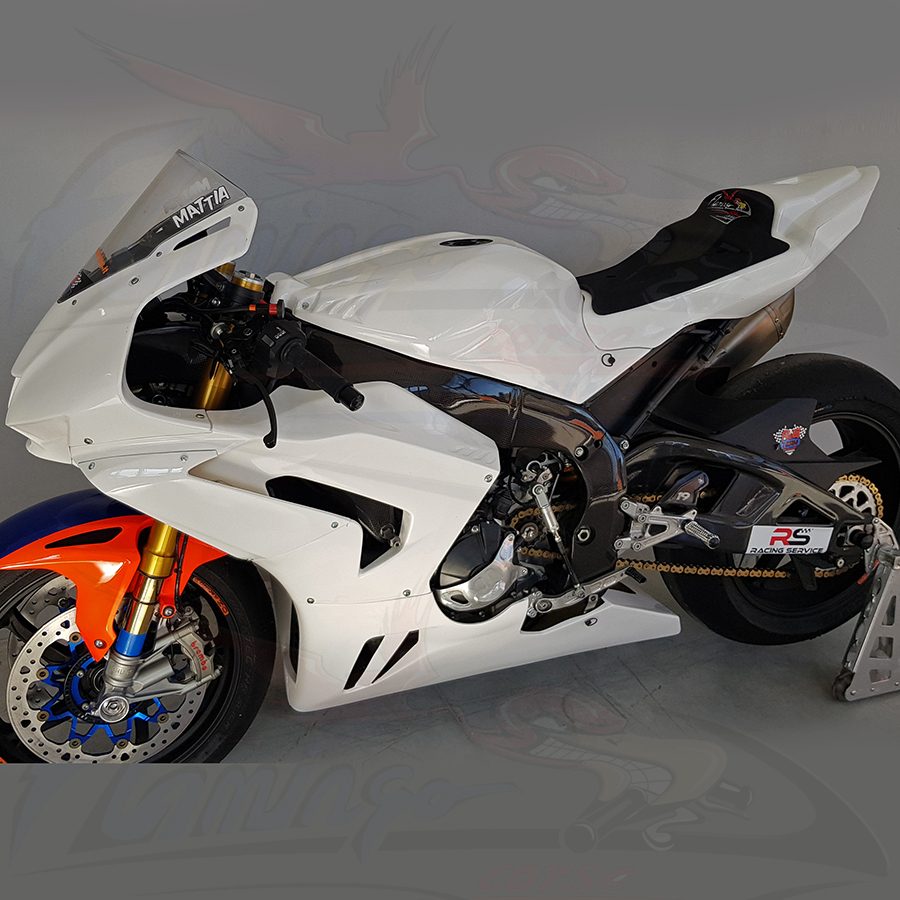 Comprensivo di: Cupolino, Fiancata Dx con deflettori, Fiancata Sx con deflettori, Puntale raccoglitore olio, codone monoposto per sella racing con sottocodone incorporato, Supporto codone, Coperchio serbatoio integrale, staffa destra, staffa sinistra, staffa puntale, 3 ricettacoli, 3 ganci rapidi, 6 rivetti.