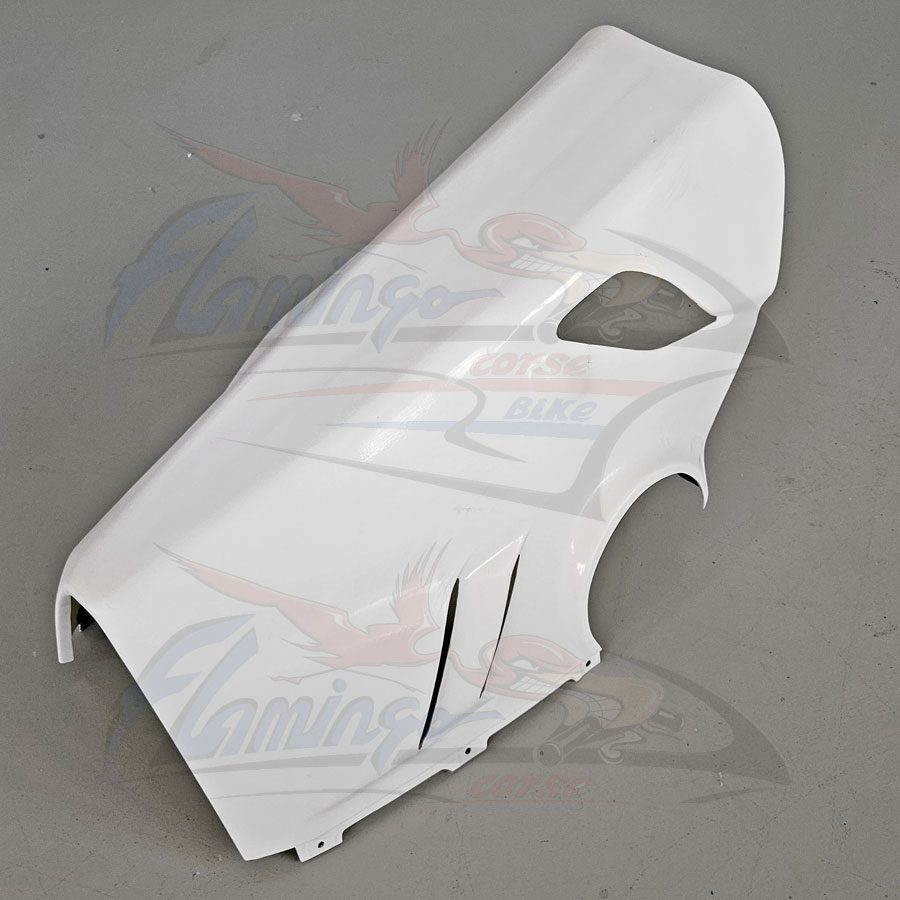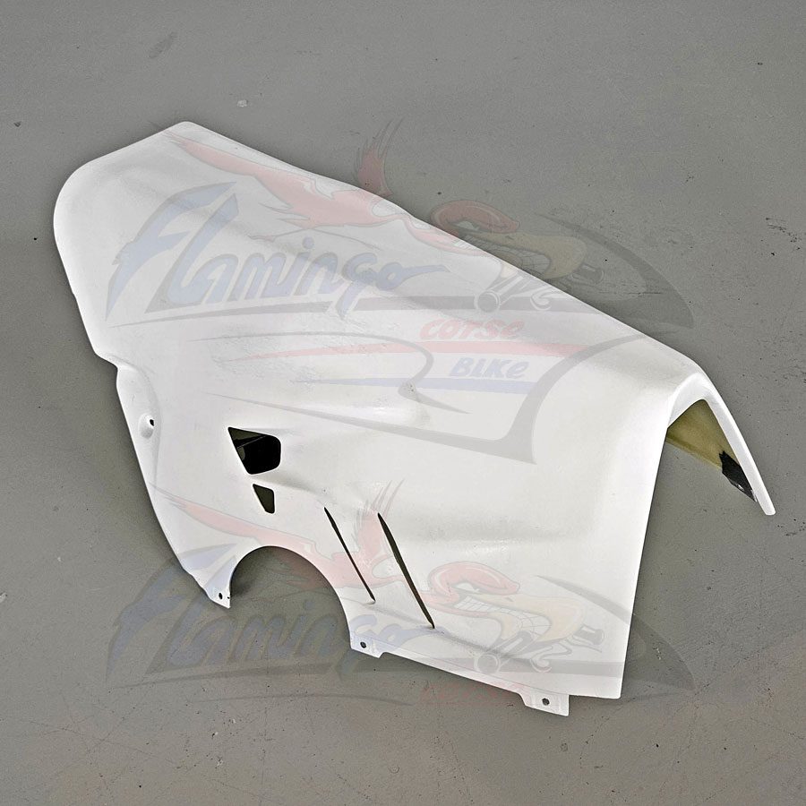 Prodotto dalla Flamingo Corse Bike per chi desidera un prodotto di altissimo livello e di una estrema facilità di montaggio, questa nuova linea ricambi viene prodotta con nuovo sistema tramite laminazione a freddo, utilizzando finissima fibra di vetro e una doppia stratificazione di Twill, la resina e di tipo sintetizzata il tutto realizzato su nostre specifiche richieste, il pezzo viene ulteriormente rinforzato con strati di carbonio nei punti di maggiore sollecitazione quali: alloggio viti, ganci e in genere tutti i punti di maggiore carico, la finitura è realizzata con un particolare gelcoat bianco anche questo con una composizione a noi dedicata per ottenere una base verniciabile di alto pregio.