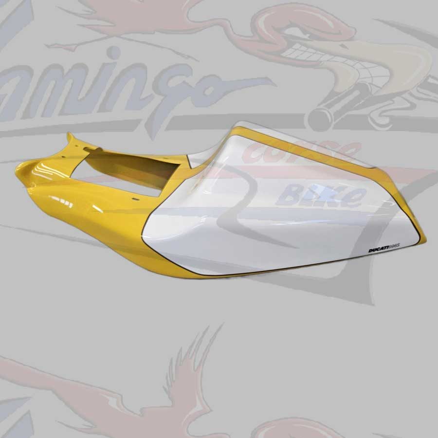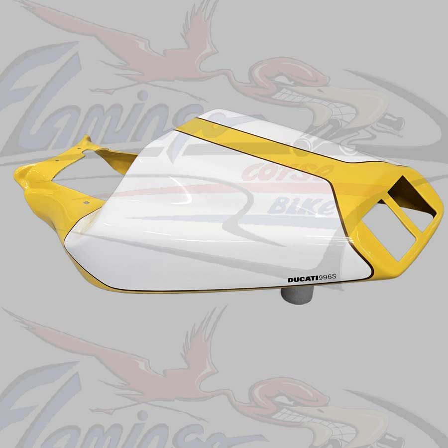 Look esclusivo con verniciatura giallo originale Ducati, padella bianca, filetto oro e la firma Ducati 996S sotto lucido brillante: qualità artigianale e stile autentico.