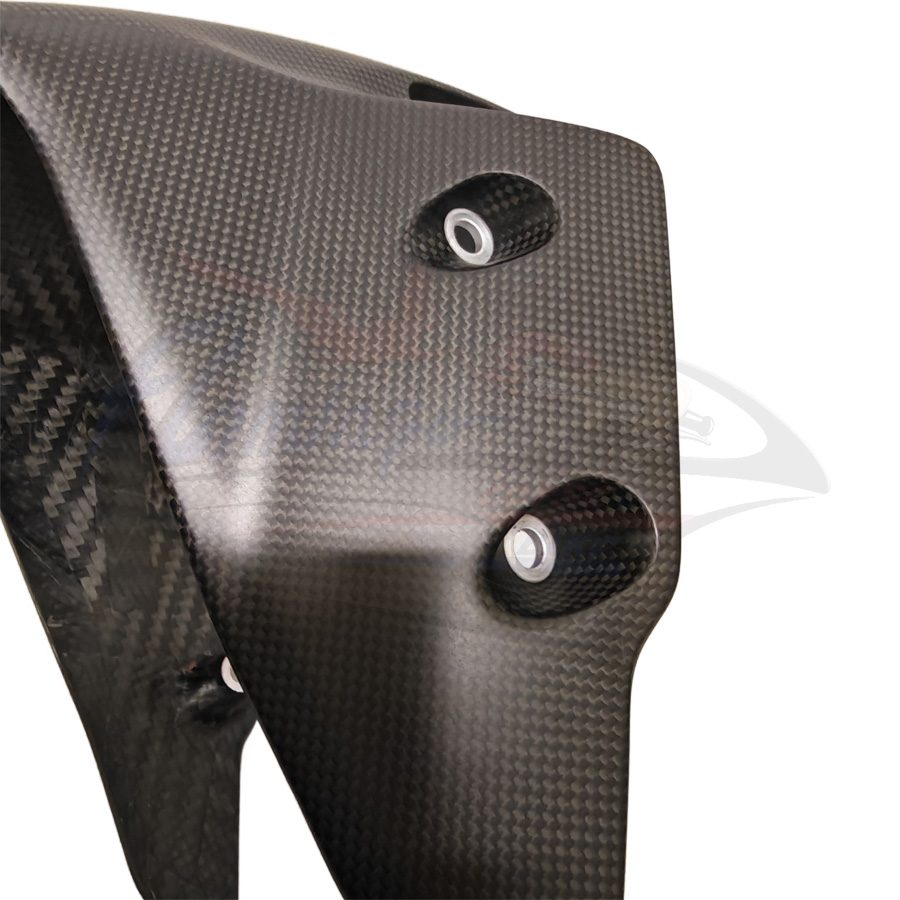 Le parti sono realizzate interamente in fibra di carbonio preimpregnato, un materiale di alta qualità che offre un perfetto equilibrio tra leggerezza e resistenza meccanica. Il processo di produzione in autoclave garantisce una struttura solida e uniforme, migliorando la resistenza agli urti e prevenendo deformazioni. Questo procedimento assicura superfici impeccabili, prive di bolle d'aria o imperfezioni. La finitura opaca con trasparente non solo valorizza l'estetica del carbonio, ma protegge anche dai raggi UV e dagli agenti atmosferici. Inoltre, la trama del carbonio utilizzata garantisce una compatibilità perfetta con il carbonio originale, eliminando qualsiasi rischio di discrepanze estetiche.