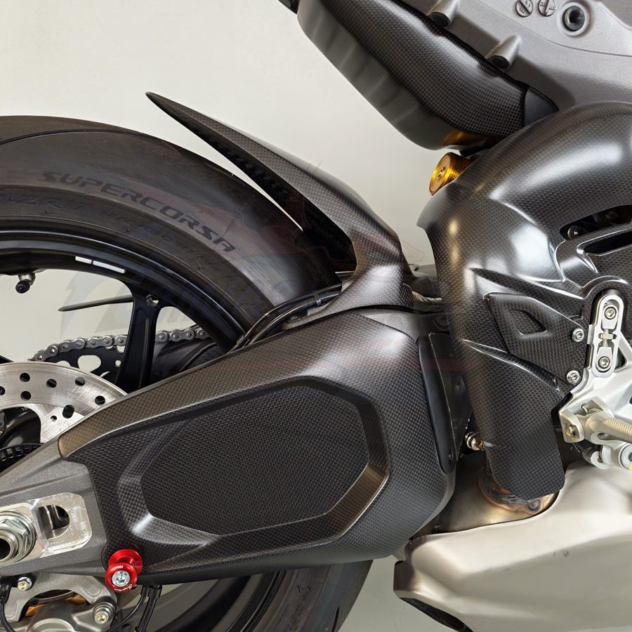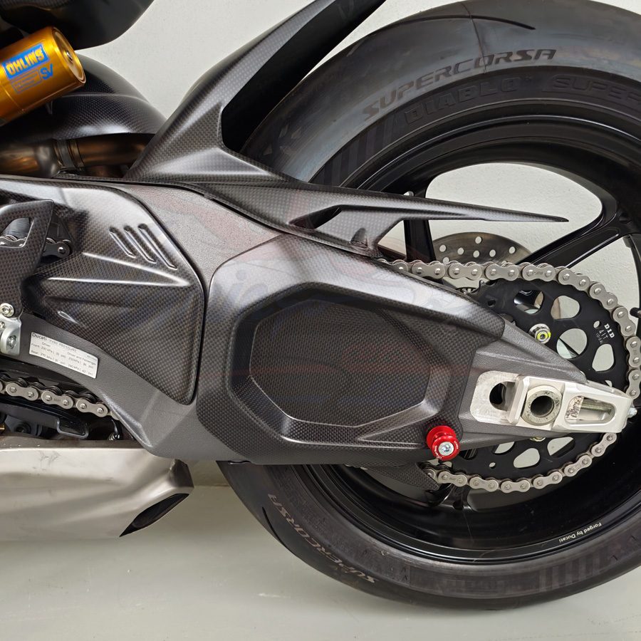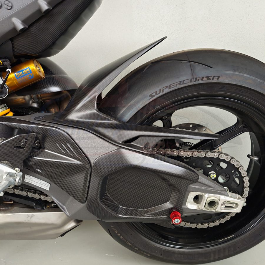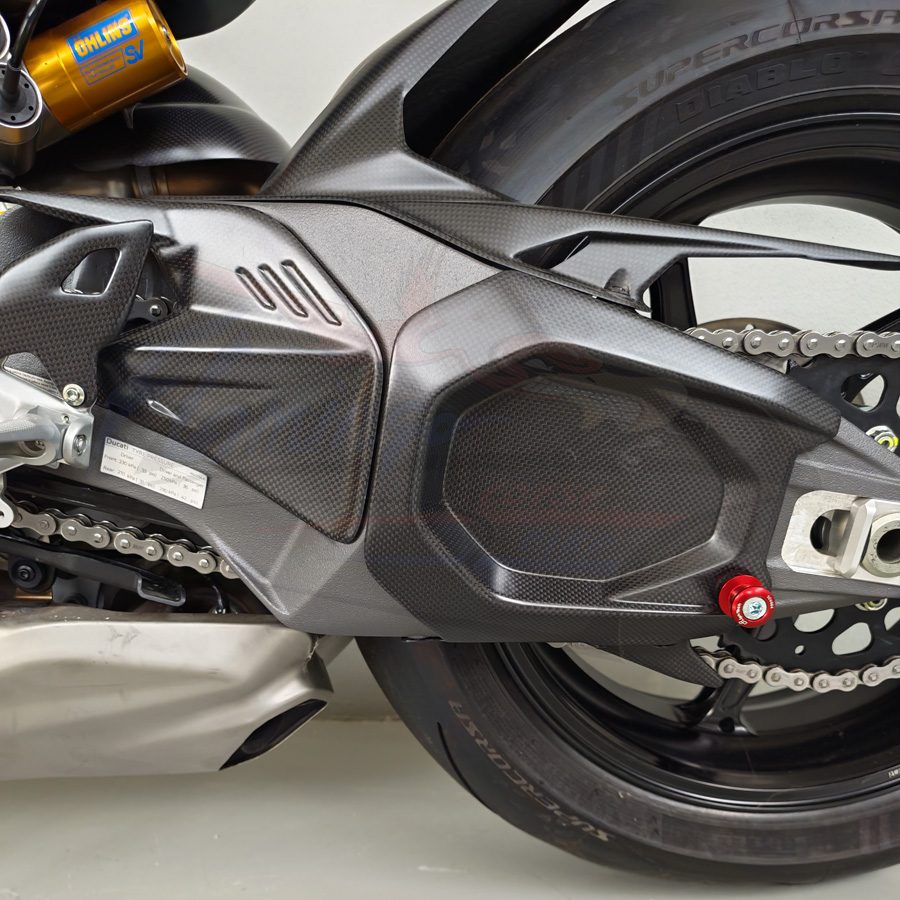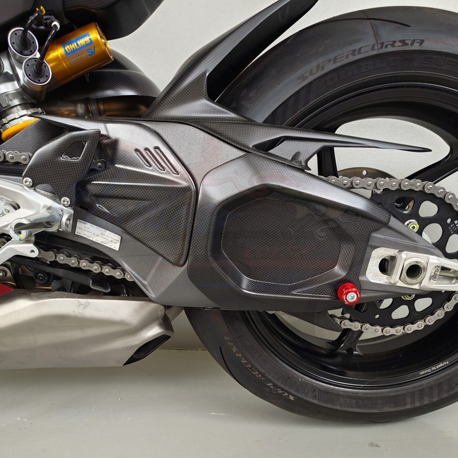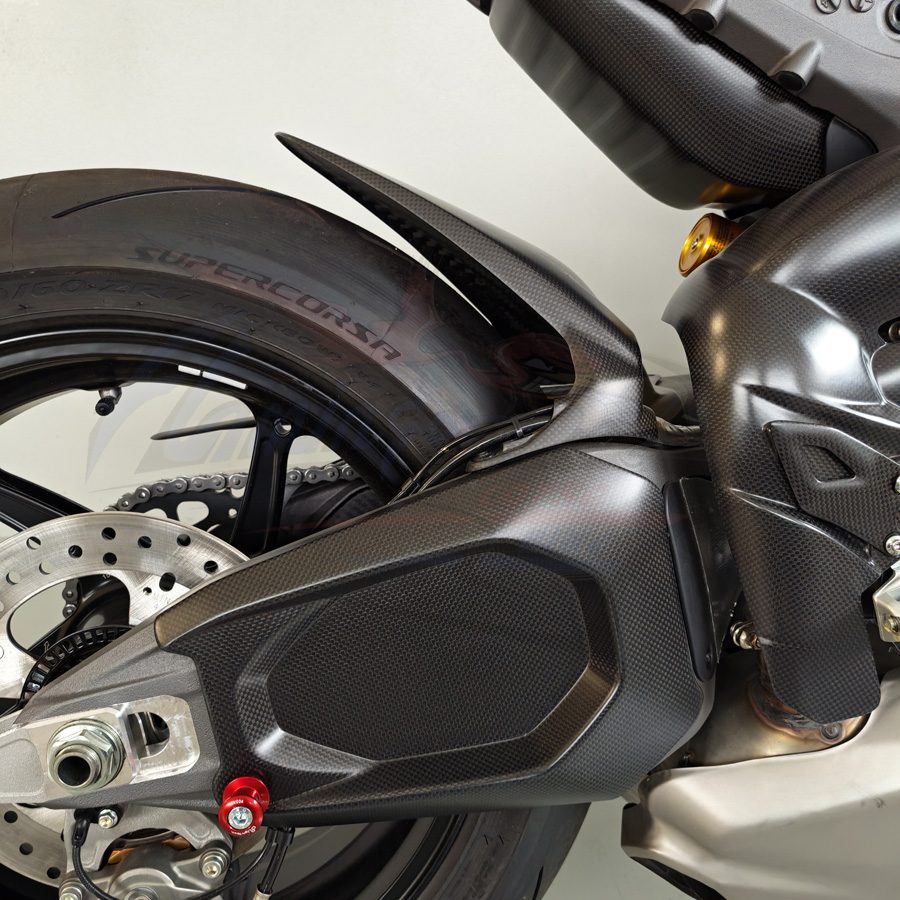 Cover forcellone realizzata in fibra di carbonio di altissima qualità, progettata specificamente per Ducati Panigale V4. Garantisce massima protezione del forcellone originale, riducendo il rischio di danneggiamenti causati da detriti, sfregamenti e utilizzo in pista, migliorando allo stesso tempo l’estetica della moto con un look racing ed esclusivo.